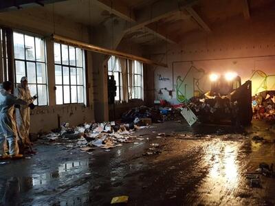 Όπως αναφέρει μιλώντας στο thebest.gr, ο αντιδήμαρχος Καθαριότητας Χρήστος Κορδάς, τα συνεργεία του Δήμου από το πρωί έχουν απομακρύνει ρούχα, στρώματα και πολλά σκουπίδια, τα οποία έχουν αφήσει εκεί οι πρόσφυγες. Μετά τον καθαρισμό από τα σκουπίδια θα ακολουθήσει το πλύσιμο και η απολύμανση των πρώην βιομηχανικών εγκαταστάσεων, ώστε οι άνθρωποι αυτοί να μπορέσουν να ζήσουν σε καλύτερες συνθήκες.