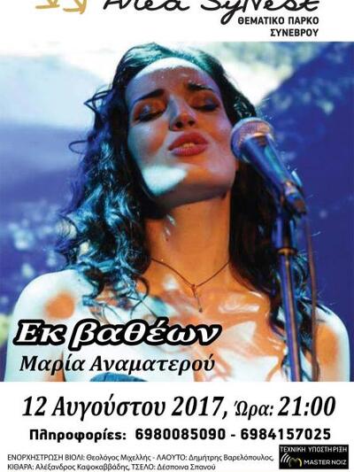 Η ερμηνεύτρια Μαρία Αναματερού θα εμφανιστεί στις 12 Αυγούστου στο θεματικό πάρκο Συνεβρού Αιγιαλείας «Area Synest» σε μια μουσική βραδιά με τίτλο ¨Εκ βαθέων¨, την οποία θα συνοδεύει μια ομάδα 4 καταξιωμένων συνεργατών με επικεφαλής τον Θεολόγο Μιχελλή. Η αοιδός μας προσκαλεί σε ένα μυστικό συναπάντημα αγαπημένων τραγουδιών, ανοίγοντας παράθυρα με θέα στις γειτονιές της Ελλάδας και του κόσμου…