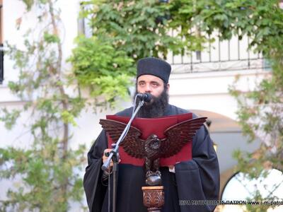 Ἐπίσης, μὲ λόγια θερμὰ ὡμίλησε γιά τὸν Ἡγούμενο τῆς Μονῆς π. Συμεὼν καὶ τὴν περὶ αὐτὸν Ἀδελφότητα, τούς ἐπήνεσε γιὰ τὴν ὀργάνωση τῆς Ἐκδηλώσεως καὶ τοὺς εὐχήθηκε κάθε εὐλογία παρὰ Κυρίου.
