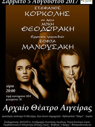 Μια σπάνια και πολύτιμη εμπειρία αναμένεται να ζήσει το κοινό που θα ανηφορίσει το Σάββατο 5 Αυγούστου 2017 στο Αρχαίο Θέατρο της Αιγείρας, για να απολαύσει τον γνωστό συνθέτη και πιανίστα Στέφανο Κορκολή, σε μια εξαιρετική μουσική «Συνάντηση», με κλασικά έργα για πιάνο, διασκευές ορχηστρικών έργων και λυρικά τραγούδια του Μίκη Θεοδωράκη, με ερμηνεύτρια την ταλαντούχα Σοφία Μανουσάκη.