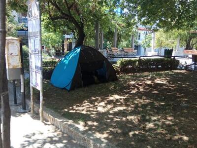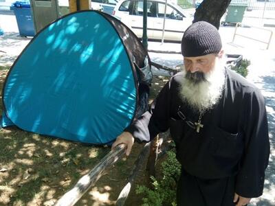 Η εικόνα ενός άστεγου κληρικού που έχει στήσει σκηνή στο κέντρο του Αγρινίου ενόσω ο υδράργυρος χτυπά «κόκκινο» προκαλεί μεγάλη εντύπωση. Μεσημέρι Κυριακής, στην πλατεία Συντριβανίου, βρίσκεται ο π. Χριστόδουλος Διαμαντόπουλος, κατά δήλωση του Αρχιμανδρίτης, καταγόμενος από το Αίγιο της Αχαΐας.