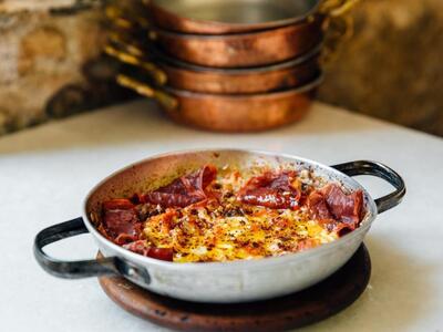 Το ξεκίνημα έγινε με δύο διαφορετικά πιάτα με 4 αυγά μάτια, και σάλτσα με φρέσκια ντομάτα. Το ένα με σουτζούκι καυτερό και το άλλο με παστουρμά.