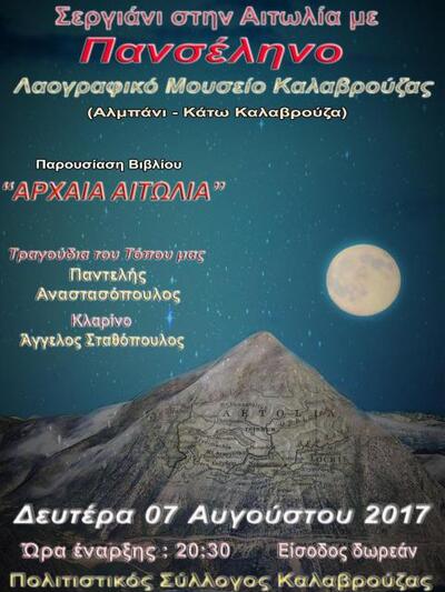 Όπως αναφέρει η πρόσκληση, θα λάβει χώρα ένα Σεργιάνι στην Αιτωλία με πανσέληνο και στο Λαογραφικό Μουσείο Καλαβρούζας (Αλμπάνι – Κάτω Καλαβρούζα) θα γίνει παρουσίαση του βιβλίου «Αρχαία Αιτωλία» και θα ακολουθήσουν τραγούδια του τόπου μας με τον Παντελή Αναστασόπουλο.
