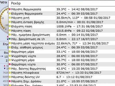 Σύμφωνα με το meteopatras.eu, σήμερα η θερμοκρασία στην Πάτρα «χτύπησε κόκκινο», καθώς στις 14:42 καταγράφηκε ρεκόρ με τον υδράργυρο να δείχνει 39.3 βαθμούς κελσίου, όπως φαίνεται και στην παρακάτω εικόνα, ωστόσο, η αισθητή θερμοκρασία ήταν μεγαλύτερη.