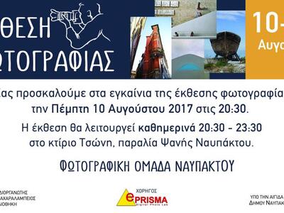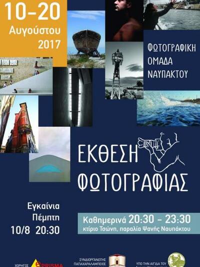 Μία έκθεση φωτογραφίας θα εγκαινιαστεί την Πέμπτη 10 Αυγούστου 2017 στην γειτονική Ναύπακτο. Πρόκειται για έκθεση από τα μέλη της Φωτογραφικής Ομάδας Ναυπάκτου που θα διαρκέσει έως και τις 20 Αυγούστου.