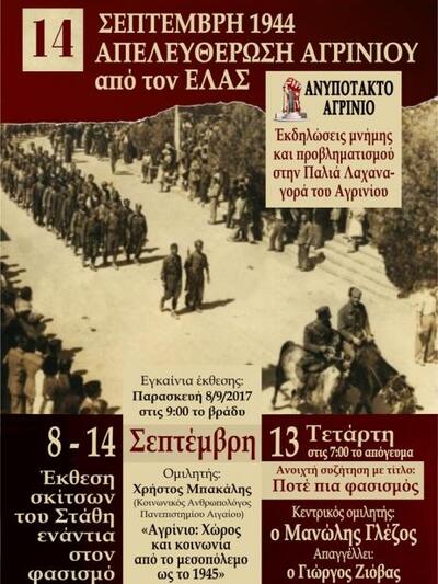 «Το ΑΝΥΠΟΤΑΚΤΟ ΑΓΡΙΝΙΟ, επιθυμώντας να αναδείξει την επέτειο της απελευθέρωσης της πόλης του Αγρινίου από την Γερμανική και Ταγματασφαλίτικη Κατοχή στις 14 Σεπτέμβρη του 1944, διοργανώνει μία σειρά εκδηλώσεων μνήμης και πολιτικού προβληματισμού με κεντρικό σύνθημα: «Ποτέ πια φασισμός».