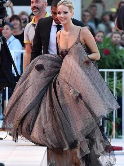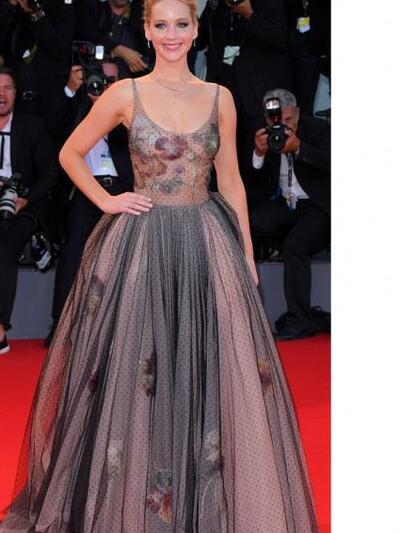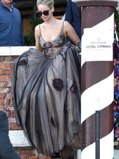 Τιμώντας την αποστολή της ως πρέσβειρα του γαλλικού κολοσσού Christian Dior η Tζένιφερ σαγήνευσε το βράδυ της πρεμιέρας με ρομαντικό ασπρόμαυρο μάξι δια χειρός Maria Grazia Chiuri. Το φόρεμα (από τη φετινή καλοκαιρινή συλλογή) ήταν φτιαγμένο από λευκά και μαύρα «φύλλα» τούλι, κεντημένα με μικρά πουά και λουλούδια που φανέρωναν το μεγαλύτερο μέρος του στήθους της. Με απλό κότσο μπαλαρίνας, η ηθοποιός πέτυχε μια επίσημη αλλά κοριτσίστικη εμφάνιση, κατάλληλη για την ηλικία της. Το εκτόπισμα της πληθωρικής φούστας την δυσκόλεψε βέβαια στις γόνδολες και τα σκαλιά της Βενετίας αλλά έτσι προέκυψαν τα πιο χαριτωμένα στιγμιότυπα.