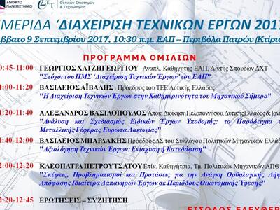 Το Ελληνικό Ανοικτό Πανεπιστήμιο / Μεταπτυχιακό Πρόγραμμα Σπουδών “Διαχείριση Τεχνικών Έργων” διοργανώνει την Ημερίδα "Διαχείριση Τεχνικών Έργων 2017". Η Ημερίδα θα πραγματοποιηθεί το Σάββατο 9 Σεπτεμβρίου 2017 και ώρα προσέλευσης 10:30 π.μ., στις εγκαταστάσεις του ΕΑΠ - Πάροδος Αριστοτέλους 18, Περιβόλα Πατρών, Κτίριο Ε.