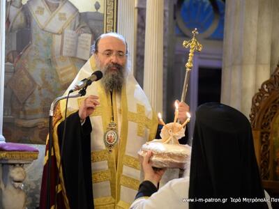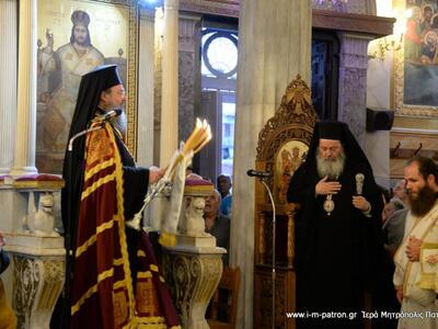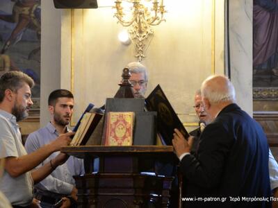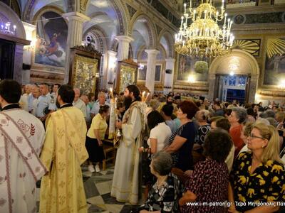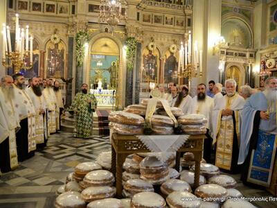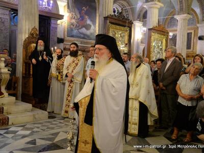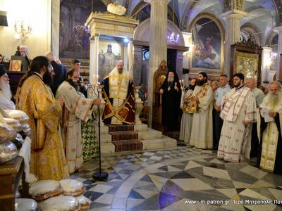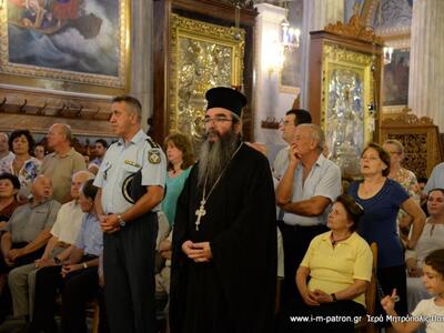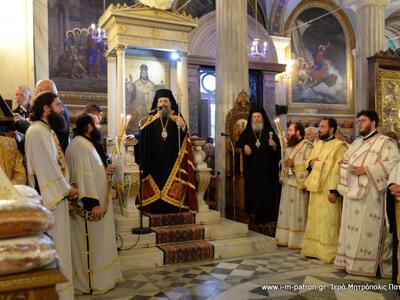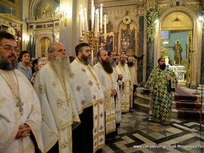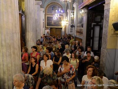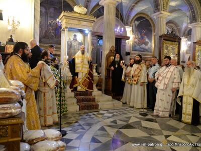 Στις 6:30 μ.μ. θα τελεστεί πανηγυρικός εσπερινός και ιερά παράκληση που θα προεξάρχει ο Αρχιμανδρίτης π. Αμβρόσιος Γκουρβέλος, προϊστάμενος του Ιερού Μητροπολιτικού Ναού Ευαγγελιστρίας Πατρών.