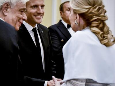 Η σύζυγος του προέδρου της Νέας Δημοκρατίας, Μαρέβα Μητσοτάκη, φόρεσε δημιουργία του δικού της brand Ζeus & Dion στα χρώματα του κόκκινου, του μπλε και του λευκού, της γαλλικής σημαίας δηλαδή, για να τιμήσει τους καλεσμένους της χώρας μας.