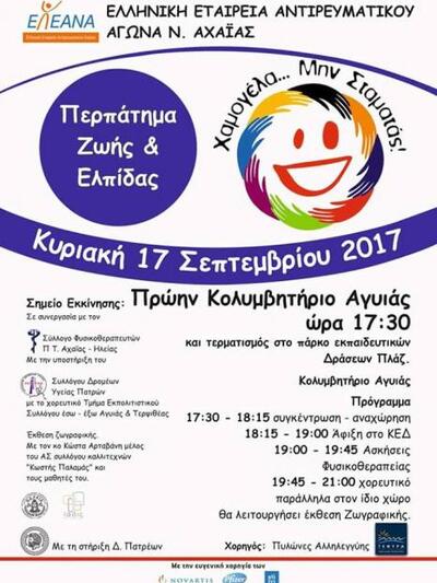 Για μια ακόμα χρονιά η Ελληνική Εταιρεία Αντιρευματικού Αγώνα (ΕΛΕΑΝΑ) νομού Αχαΐας διοργανώνει το «Περπάτημα Ζωής και Ελπίδας», το οποίο θα διεξαχθεί την Κυριακή 17 Σεπτεμβρίου 2017, στο πρώην κολυμβητήριο Αγυιάς στην Πάτρα.