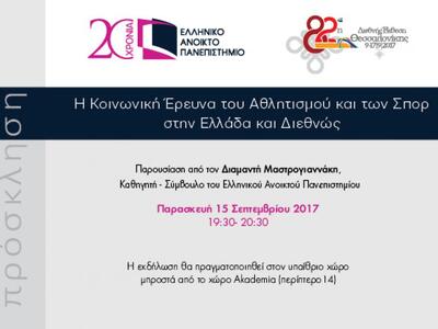 Πιο συγκεκριμένα, την Παρασκευή 15 Σεπτεμβρίου 2017 στις 19:30, θα πραγματοποιηθεί η παρουσίαση του Καθηγητή – Συμβούλου του ΕΑΠ, Διαμαντή Μαστρογιαννάκη με τίτλο: «Η Κοινωνική Έρευνα του Αθλητισμού και των Σπορ στην Ελλάδα και Διεθνώς» στον υπαίθριο χώρο μπροστά από το Περίπτερο 14 (Academia).