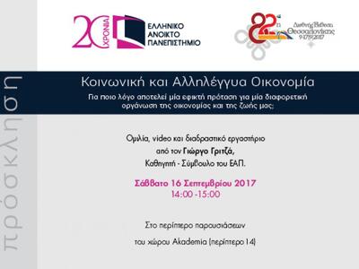 Το Σάββατο 16 Σεπτεμβρίου 2017 στις 14:00 θα ακολουθήσει Ομιλία και Διαδραστικό Εργαστήριο από τον Καθηγητή – Σύμβουλο του ΕΑΠ, Γιώργο Γριτζά με τίτλο: «Κοινωνική και Αλληλέγγυα Οικονομία: Για ποιο λόγο αποτελεί μία εφικτή πρόταση για μία διαφορετική οργάνωση της οικονομίας και της ζωής μας;», στον χώρο παρουσιάσεων Academia (Περίπτερο 14).