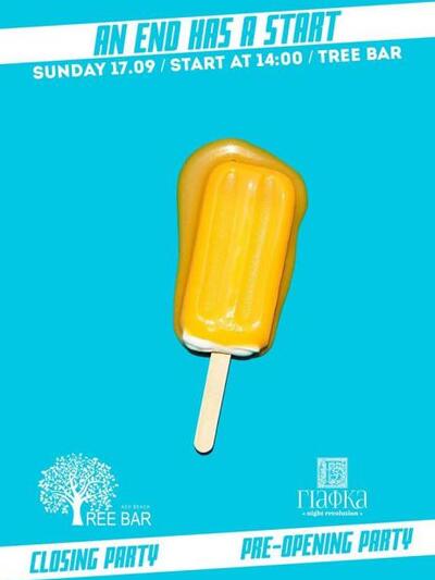 Οι καλύτερες θάλασσες είναι τον Σεπτέμβριο και το Tree Bar στα Καμίνια αποχαιρετά με ένα πάρτυ την καλοκαιρινή σεζόν αυτή την Κυριακή. Με τον εύστοχο τίτλο "An end has a start" και τη σύμπραξη της Γιάφκας, δεν υπάρχει καλύτερος τρόπος για να γιορτάσουμε τις τελευταίες ημέρες του καλοκαιριού άλλά και την έναρξη της νέας σεζόν.