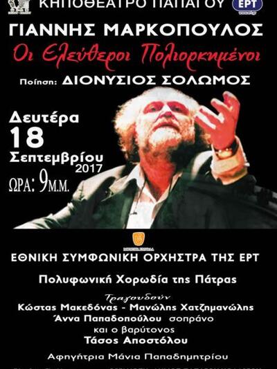 Νέα συνεργασία με τον μεγάλο Έλληνα συνθέτη Γιάννη Μαρκόπουλο θα έχει η Μικτή Χορωδία του Καλλιτεχνικού Ομίλου της Πολυφωνικής (Διεύθυνση: Σταύρος Σολωμός), στη συναυλία που θα δοθεί τη Δευτέρα 18 Σεπτεμβρίου 2017, στις 9 το βράδυ, στο χωρητικότητας 1.500 ατόμων και πλήρως ανακαινισμένο ανοικτό Θέατρο Παπάγου στην Αθήνα, όπου θα ερμηνεύσει το έργο: "Οι Ελεύθεροι Πολιορκημένοι’’, σε ποίηση Διονυσίου Σολωμού και μουσική του Γ. Μαρκόπουλου.