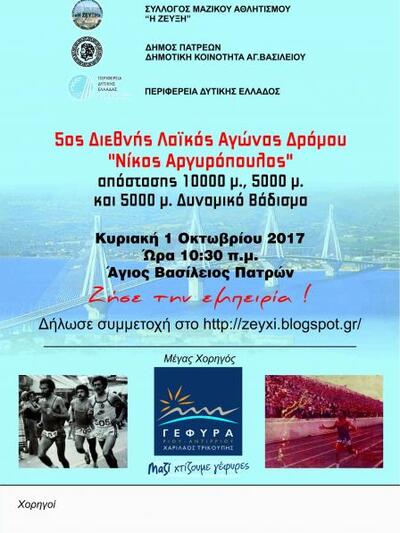 Συνεχίζονται οι εγγραφές για τον 5ο Αγώνα Ζεύξηrun Νίκος Αργυρόπουλος που διοργανώνει ο Σύλλογο Μαζικού Αθλητισμού <<Η ΖΕΥΞΗ>> σε συνεργασία με την Τ.Κ.Αγίου Βασιλείου Πατρών και την περιφέρεια Δυτικής Ελλάδος, με πολύ μεγάλη συμμετοχή αθλητών και αθλητριών στα 5000μ. και στα 10000μ. που θα διεξαχθεί την 1-10-17 στον Άγιο Βασίλειο Πατρών .