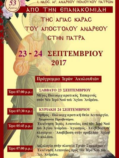 Το πρόγραμμα περιλαμβάνει στις 19.00 το απόγευμα του Σαββάτου 23/9/2017, πολυαρχιερατικό εσπερινό στο νέο ιερό ναό του Αγ. Ανδρέου και την Κυριακή 24/9 το πρωί πανηγυρική Θεία λειτουργία όπου θα λάβει χώρα και χειροτονία Πρεσβυτέρου.