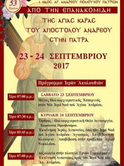 Το πρόγραμμα περιλαμβάνει στις 19.00 το απόγευμα του Σαββάτου 23/9/2017, πολυαρχιερατικό εσπερινό στο νέο ιερό ναό του Αγ. Ανδρέου και την Κυριακή 24/9 το πρωί πανηγυρική Θεία λειτουργία όπου θα λάβει χώρα και χειροτονία Πρεσβυτέρου.