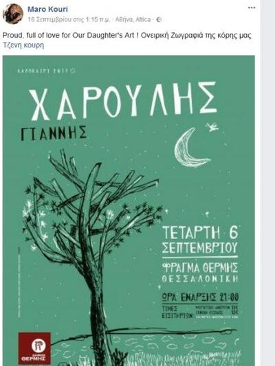 Βέβαια στην εποχή των social media τίποτα δεν μένει κρυφό. Μπορεί να γνωρίζουμε ότι ο Γιάννης Χαρούλης έχει μια κόρη όμως τίποτα παραπάνω μέχρι που η μητέρας της, Μάρω Κουρή μοιράστηκε στο facebook μια αφίσα συναυλία του τραγουδιστή την οποία φιλοτέχνησε η κόρη τους, Τζένη.