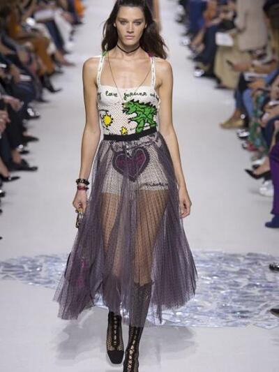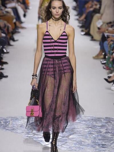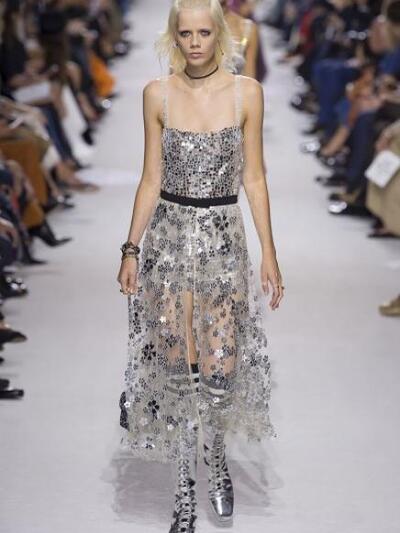Η ιταλίδα designer Maria Grazia Chiuri κήρυξε ελευθερία αισθητικών επιρροών διατηρώντας το στίγμα της φεμινίστριας δημιουργού. Μετά τα τι-σερτ περί φεμινισμού που έκαναν θραύση στην αγορά, έδειξε μπλουζάκι για τις γυναίκες στην τέχνη και «έπαιξε» κεφάτα με ναυτικά ριγέ, χαλαρά τζιν και τσάντες με logos. Τα διάφανα φορέματα «μπαλαρίνας» ήταν λιγότερο βαρύγδουπα με χαρούμενα κοριτσίστικα χρώματα, τούλινα πουά, disco χάντρες. Είδαμε και «κορμάκια» από βελονάκι με σκίτσα, συνδυασμένα με αιθέριες μίντι φούστες. Οι χαρακτηριστικές τιράντες με το όνομα του brand παραμένουν.