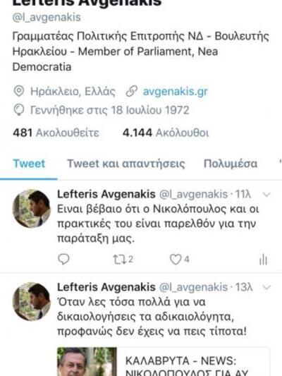 Ο κ. Αυγενάκης μιλώντας στα Καλάβρυτα που βρέθηκε την Κυριακή χαρακτήρισε τον κ. Νικολόπουλο «πλανώδιο παραγοντίσκο που πρόδωσε την παράταξή που τον ανέδειξε» και τόνισε ότι η Ν.Δ. δεν έχει ανάγκη να την "πατρονάρει κανένας". Όσο αφορά την θέση της Ν.Δ. για τις Επιμελητηριακές εκλογές, τόνισε ότι «χρίσματα η Ν.Δ. δεν μοιράζει...». Επίσης ανέβασε post στην προσωπική του σελίδα στο facebook στο οποίο έγραφε: «Είναι βέβαιο ότι ο Νικολόπουλος και οι πρακτικές του είναι παρελθόν γα την παράταξή μας».
