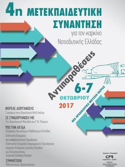 Όπως αναφέρει σχετική ανακοίνωση, η ομάδα «Γυναίκες στη Ογκολογία» W4O - Hellas σε συνεργασία με την Ογκολογική Μονάδα του Γ. Ν. Πατρών διοργανώνει τη 4η Μετεκπαιδευτική Συνάντηση για τον Καρκίνο Νοτιοδυτικής Ελλάδας με κεντρικό θέμα «Αντιπαραθέσεις», την Παρασκευή 6 & το Σάββατο 7 Οκτωβρίου 2017 στο Νέο Αρχαιολογικό Μουσείο Πατρών.
