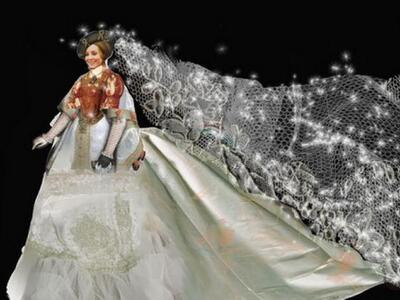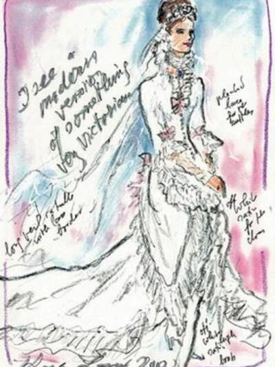 «Κάτι παλιό. Φούστα βικτωριανού στιλ. Κάτι νέο: Φόρεμα από patchwork. Κάτι δανεικό: το βέλο της βασίλισσας Ελισάβετ. Κάτι κόκκινο: ελισαβετιανό κόκκινο τοπ, αφού το κόκκινο ήταν το χρώμα των γάμων μέχρι το 1900»- Christian Lacroix