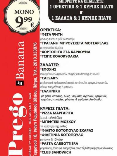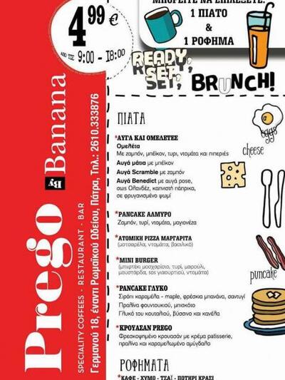 Δυναμικά ξεκίνησε η νέα σαιζόν για το Prego by Banana day & night στην οδό Γερμανού 18, στην αγαπημένη γωνία του Ρωμαϊκού Ωδείου, συνεχίζοντας την ξεχωριστή παρουσία του στην πόλη, όπου από τις 8.30 το πρωί σας προσφέρει speciality coffee, που φέρνει, αποκλειστικά για τους επισκέπτες του, από την Κολομβία και το Περού, φυσικούς χυμούς και διαλεκτά πιάτα για ένα γευστικότατο brunch με την γνωστή ποιότητα των υλικών του Prego, στην εκπληκτική τιμή 4,99€!!!