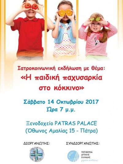 Ιατροκοινωνική εκδήλωση σε συνεργασία με την Περιφέρεια Δυτικής Ελλάδας με θέμα: Η παιδική παχυσαρκία στο «κόκκινο» Σάββατο 14 Οκτωβρίου 2017 / Ώρα 7 μ.μ. Ξενοδοχείο PATRAS PALACE (Όθωνος Αμαλίας 15 - Πάτρα)