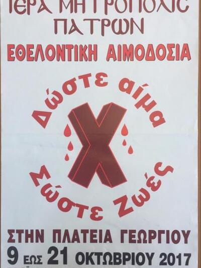Εθελοντικές αιμοδοσίες πραγματοποιεί η Ιερά Μητρόπολη Πατρών από τις 9 έως τις 21 Οκτωβρίου. Οι αιμοδοσίες θα γίνονται στην Πλατεία Γεωργίου από τις 9:30 το πρωί μέχρι τη 1 το μεσημέρι και από τις 5:30 το απόγευμα έως τις 8:30 το βράδυ.