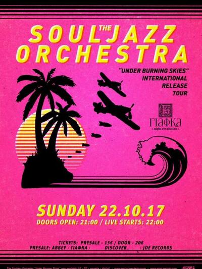 LINKS: • The Souljazz Orchestra: www.souljazzorchestra.com | www.facebook.com/souljazzorchestra • ΓΙΑΦΚΑ: www.facebook.com/YAFKA2015 • Love Light Productions: www.facebook.com/lovelightprods ΓΙΑΦΚΑ presents: The Souljazz Orchestra (CAN) live Κυριακή 22 Οκτωβρίου 2017 Οι πόρτες ανοίγουν στις 21:00 Εισιτήρια Προπώληση: 15€, Στην πόρτα: 20€ Σημεία Προπώλησης: Abbey - Kitchen Bar, ΓΙΑΦΚΑ, Discover, Joe Records
