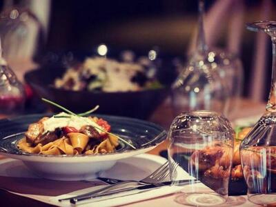-Φρέσκες παπαρδέλες με χοιρινά φιλετάκια,μανιτάρια Porto bello,ντοματίνια Σαντορίνης και Κενέλ παρμεζάνας.