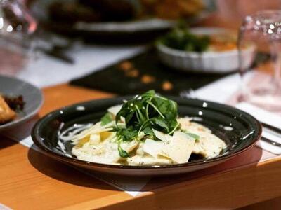 -Χειροποιητα ραβιόλια γεμιστά με μους τυριών,ρόκα και σάλτσα παρμεζάνας.