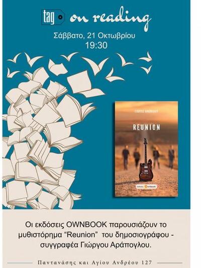 To Τag ξεφυλλίζει ξανά την πολιτιστική του ατζέντα και σας προσκαλεί σε συνεργασία με τις εκδόσεις “Ownbook” στην παρουσίαση του μυθιστορήματος "Reunion"του δημοσιογράφου και συγγραφέα, Γιώργου Αράπογλου. Το "Reunion" δεν είναι ένα αστυνομικό μυθιστόρημα. Είναι μια περιπλάνηση σε βαθιά κρυμμένες επιθυμίες και καταπιεσμένους πόθους.Στο τέλος, όπως συμβαίνει και στη ζωή, κανένας πλέον δεν ακολουθεί τον δρόμο που είχε βαδίσει μέχρι τώρα.