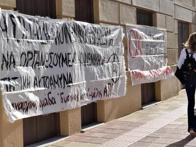 Έξω από το Ειρηνοδικείο είχαν τοποθετηθεί πανό που έγραφαν «όχι στους πλειστηριασμούς κατοικιών, όχι στις εξώσεις, όχι στις διακοπές ηλεκτρικού ρεύματος και νερού» καθώς κι ένα πανό που μιλούσε για κοινωνική, ταξική αυτοάμυνα.