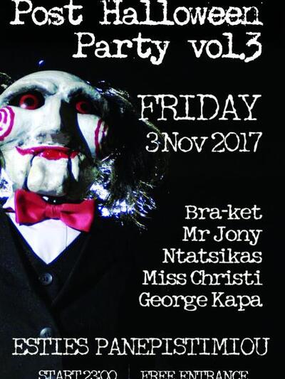 Στην Πάτρα διοργανώνεται ένα Post Halloween Party Vol.3, όπως το ονομάζουν που θα γίνει για μία ακόμη χρονιά, στο θέατρο της Εστίας του Πανεπιστημίου της Πάτρας στο Ρίο την Παρασκευή 3 Νοεμβρίου 2017 μετά τις 11 το βράδυ, με ελεύθερη είσοδο.