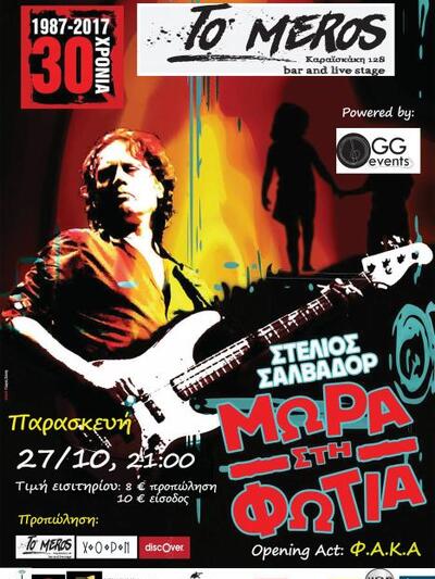 Ένα θρυλικό συγκρότημα που εδώ και τρεις δεκαετίες αποτελεί αναπόσπαστο κομμάτι της ιστορίας της μουσικής έχοντας στο ενεργητικό τους εξαιρετικές συνεργασίες, συμμετοχές σε σημαντικά φεστιβάλ και ξεχωριστές μελοποιήσεις στα ποιήματα Ελλήνων μεγάλων ποιητών και ο Στέλιος Σαλβαδόρ, ο απόλυτος ζωντανός μύθος της σκηνής, από τους σημαντικότερους εκφραστές του ελληνόφωνου ροκ και από τους πιο πιστούς εκπροσώπους του, θα ανέβουν στη σκηνή του μπαρ και live stage “To Meros” στην οδό Καραϊσκάκη 128.