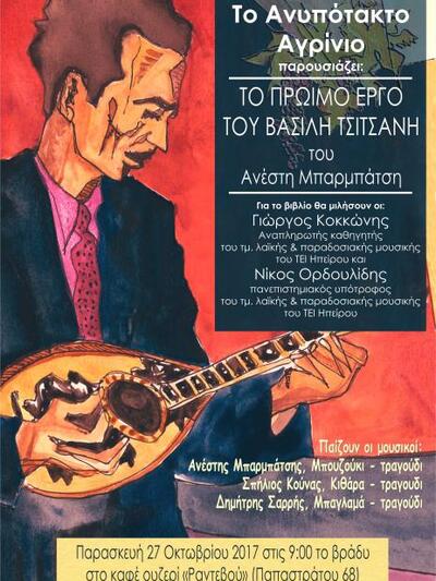 Το Ανυπότακτο Αγρίνιο Λαική Συνέλευση παρουσιάζει την Παρασκευή 27 Οκτωβρίου 2017 στις 21.00 το βράδυ στο καφέ ουζερί «Ραντεβού» στην οδό Παπαστράτου 68, στο Αγρίνιο, το βιβλίο/cd του Ανέστη Μπαρμπάτση «Το Πρώιμο έργο του Βασίλη Τσιτσάνη».