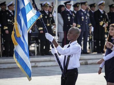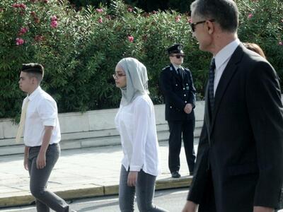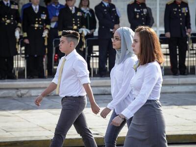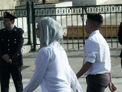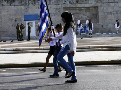 Με μαντίλες παρέλασαν αρκετές μαθήτριες στη σημερινή παρέλαση για την επέτειο της 28ης Οκτωβρίου, στο κέντρο της Αθήνας. Όπως συνηθίζεται τα τελευταία χρόνια, αντί για τμήματα παρελάσεων από επιλεγμένα σχολεία, συμμετέχουν όλα τα σχολεία της Α' Αθηνών (δημοτικά, γυμνάσια και λύκεια), με τον σημαιοφόρο τους και πέντε παραστάτες το καθένα.