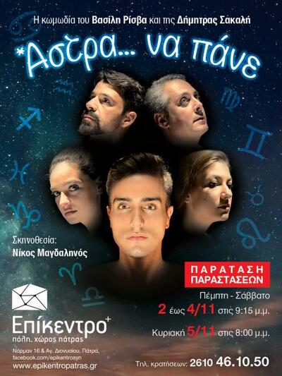 Μετά την επιτυχία της κωμωδίας «Άστρα να πάνε», το θέατρο Επίκεντρο+ ανακοινώνει την παράταση των παραστάσεων για την επόμενη Πέμπτη 2, Παρασκευή 3, Σάββατο 4 και Κυριακή 5 Νοεμβρίου. Το «Άστρα να πάνε» είναι έργο των Βασ. Ρίσβα και Δήμ. Σακαλή σε σκηνοθεσία Νίκου Μαγδαληνού το οποίο ανέβηκε το Σεπτέμβριο και έχει αφήσει τις καλύτερες εντυπώσεις στο κοινό της Πάτρας.
