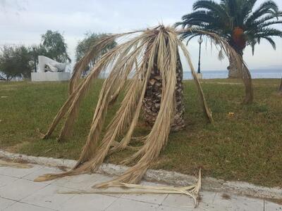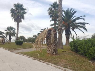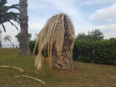 Δύο ακόμη μαραμένοι φοίνικες, στέκουν κούφιοι μετά την επέλαση από το εσωτερικό τους, του κόκκινου σκαθαριού. Το οποίο ευθύνεται για την καταστροφή εκατοντάδων οικιακών, όπως επίσης και άλλων φοινικόδεντρων που έχουν τοποθετηθεί για να συντηρηθεί το πράσινο και η καλαισθησία σε αρκετά σημεία της πόλης.
