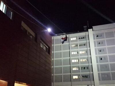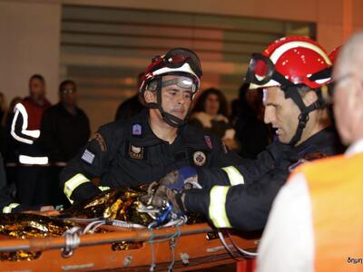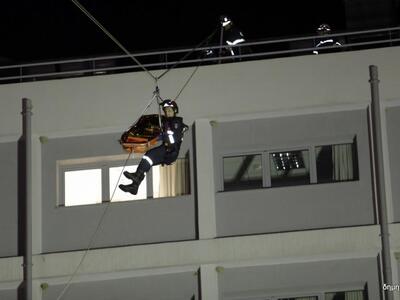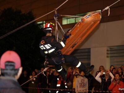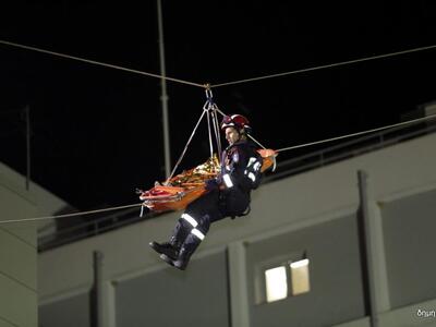 Η πιο εντυπωσιακή στιγμή της νυχτερινής άσκησης της Π.Υ. που για τους περισσότερους αποτελούσε πρωτόγνωρη εικόνα, ήταν όταν μέλη του ορειβατικού τμήματος της ΕΜΑΚ ανέλαβαν τη διάσωση τραυματισμένου εργαζομένου από το πολυώροφο του Αγ. Ανδρέα και πιο συγκεκριμένα, από την ταράτσα, σε ύψος τουλάχιστον 20 μέτρων από το έδαφος.