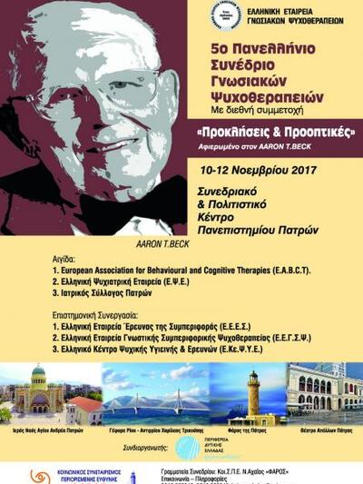 Η Περιφέρεια Δυτικής Ελλάδας σε συνεργασία με την Ελληνική Εταιρεία Γνωσιακών Ψυχοθεραπειών (Ε.Ε.Γ.Ψ.) και την συνδιοργάνωση του ΚΟΙ.Σ.Π.Ε.« Φάρος» και του Κέντρου Ψυχικής Υγιεινής Πάτρας διοργανώνουν το 5ο Πανελλήνιο Συνέδριο Γνωσιακών Ψυχοθεραπειών με θέμα: «Γνωσιακή Ψυχοθεραπεία: Προκλήσεις & Προοπτικές», που φέτος φιλοξενείται στην πόλη των Πατρών, στο Συνεδριακό Κέντρο του Πανεπιστημίου στο Ρίο στις 10-12 Νοεμβρίου 2017.