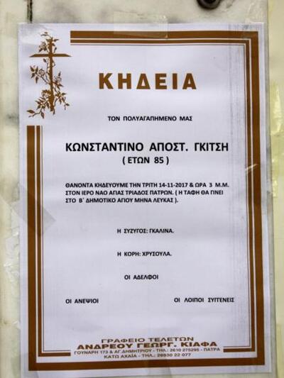 Από τον Ιερό Ναό Αγίας Τριάδας Πατρών τελείται η νεκρώσιμος ακολουθία για τον γνωστό πατρινό ζαχαροπλάστη Κωνσταντίνο Γκίτση, που έφυγε από τη ζωή το βράδυ της Κυριακής σε ηλικία 85 ετών, από ανακοπή καρδιάς.