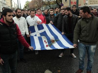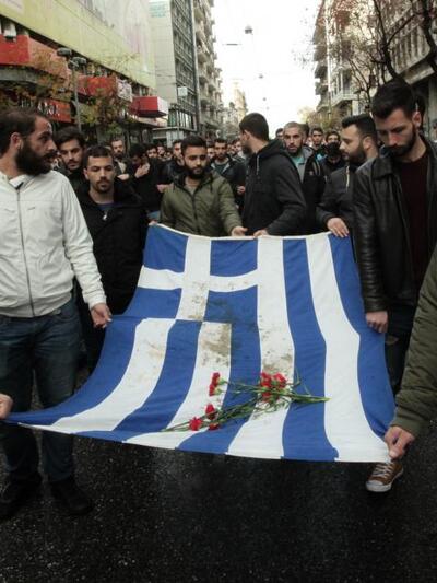 Κατόπιν το μπλοκ με τη σημαία συγκροτήθηκε πάλι και θα κινηθεί προς την αμερικάνικη πρεσβεία.