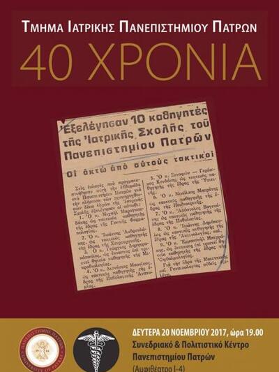 Το Τμήμα Ιατρικής του Πανεπιστημίου Πατρών συμπληρώνει τα 40 χρόνια λειτουργίας του και θα τα γιορτάσει με επετειακή εκδήλωση που θα πραγματοποιηθεί σήμερα Δευτέρα, 20 Νοεμβρίου 2017 (ώρα: 19.00), στο Συνεδριακό και Πολιτιστικό Κέντρο. Την εκδήλωση θα προσφωνήσουν η Πρύτανις, Καθηγήτρια Παθολογίας – Ενδοκρινολογίας του Τμήματος, Βενετσάνα Κυριαζοπούλου, και θα ακολουθήσουν χαιρετισμοί από τον Κοσμήτορα της Σχολής Επιστημών Υγείας, Καθηγητή Ακτινοθεραπευτικής Ογκολογίας, Δημήτριο Καρδαμάκη, τον Πρόεδρο του Τμήματος Ιατρικής, Καθηγητή Νεφρολογίας, Δημήτριο Γούμενο, καθώς και από τον Καθηγητή ΩΡΛ του Τμήματος κ. Στέφανο Ναξάκη (με την ιδιότητα ενός εκ των πρώτων αποφοίτων του Τμήματος, 1977 - 1983). Θα ακολουθήσει αφιέρωμα (προβολή βίντεο) για τα 40 χρόνια του Τμήματος.