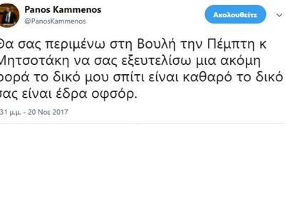 "Θα σας περιμένω στη Βουλή την Πέμπτη κ. Μητσοτάκη να σας εξευτελίσω μια ακόμη φορά το δικό μου σπίτι είναι καθαρό το δικό σας είναι έδρα οφσόρ" αναφέρει ο πρόεδρος των Ανεξάρτητων Ελλήνων και υπουργός Εθνικής 'Αμυνας, Πάνος Καμμένος στον προσωπικό του λογαριασμό στο Twitter