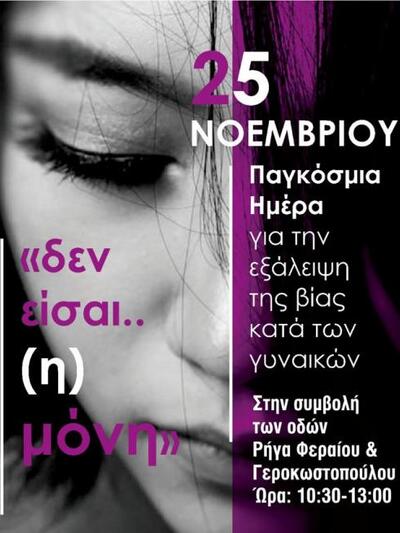 Την επόμενη μέρα στις 25 Νοεμβρίου, στην Πάτρα και συγκεκριμένα, στην συμβολή των οδών Ρήγα Φεραίου & Γεροκωστοπούλου από τις 10:30 έως 13:00, θα διανεμηθεί ενημερωτικό υλικό, όπου θα στοχεύει στην πληροφόρηση και στην ενημέρωση, για τις διάφορες μορφές της βίας στη σύγχρονη κοινωνία, όπως επίσης και για τις υφιστάμενες συμβουλευτικές κοινωνικές δομές που εδρεύουν στην Περιφέρεια Δυτικής Ελλάδας.