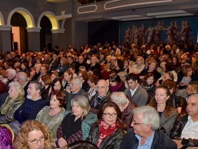 Στην κατάμεστη σάλα εκδηλώσεων του Royal (πλατεία και θεωρεία γέμισαν ακροατές) καταχειροκροτήθηκε το ντουέτο Μανώλη Μητσιά και Καρυοφυλλιάς Καραμπέτη την περασμένη Τρίτη το βράδυ. Ο καταξιωμένος ερμηνευτής και η περιζήτητη ηθοποιός θύμισαν στο πατρινό κοινό πολυαγαπημένα τραγούδια του αξεπέραστου στιχουργού Νίκου Γκάτσου σε μουσική των Μάνου Χατζιδάκι, Μίκη Θεοδωράκη, Σταύρου Ξαρχάκου, Δήμου Μούτση, Λουκιανού Κηλαηδόνη και Ηλία Ανδριόπουλου