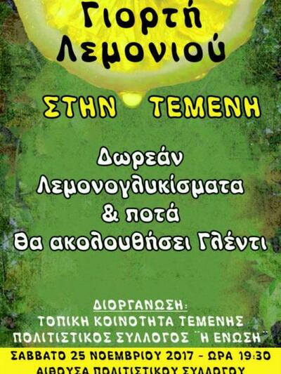 Η 2η Γιορτή Λεμονιού στην Τέμενη θα γίνει το Σάββατο 25/11/2017 στις 19.30 το απόγευμα, στην αίθουσα του Πολιτιστικού συλλόγου της Τέμενης με συνδιοργανώτρια την τοπική κοινότητα. Θα προσφερθούν δωρεάν λεμονογλυκίσματα όπως λεμονόπιτα και ποτά (χυμοί και λικέρ) και θα ακολουθήσει γλέντι.